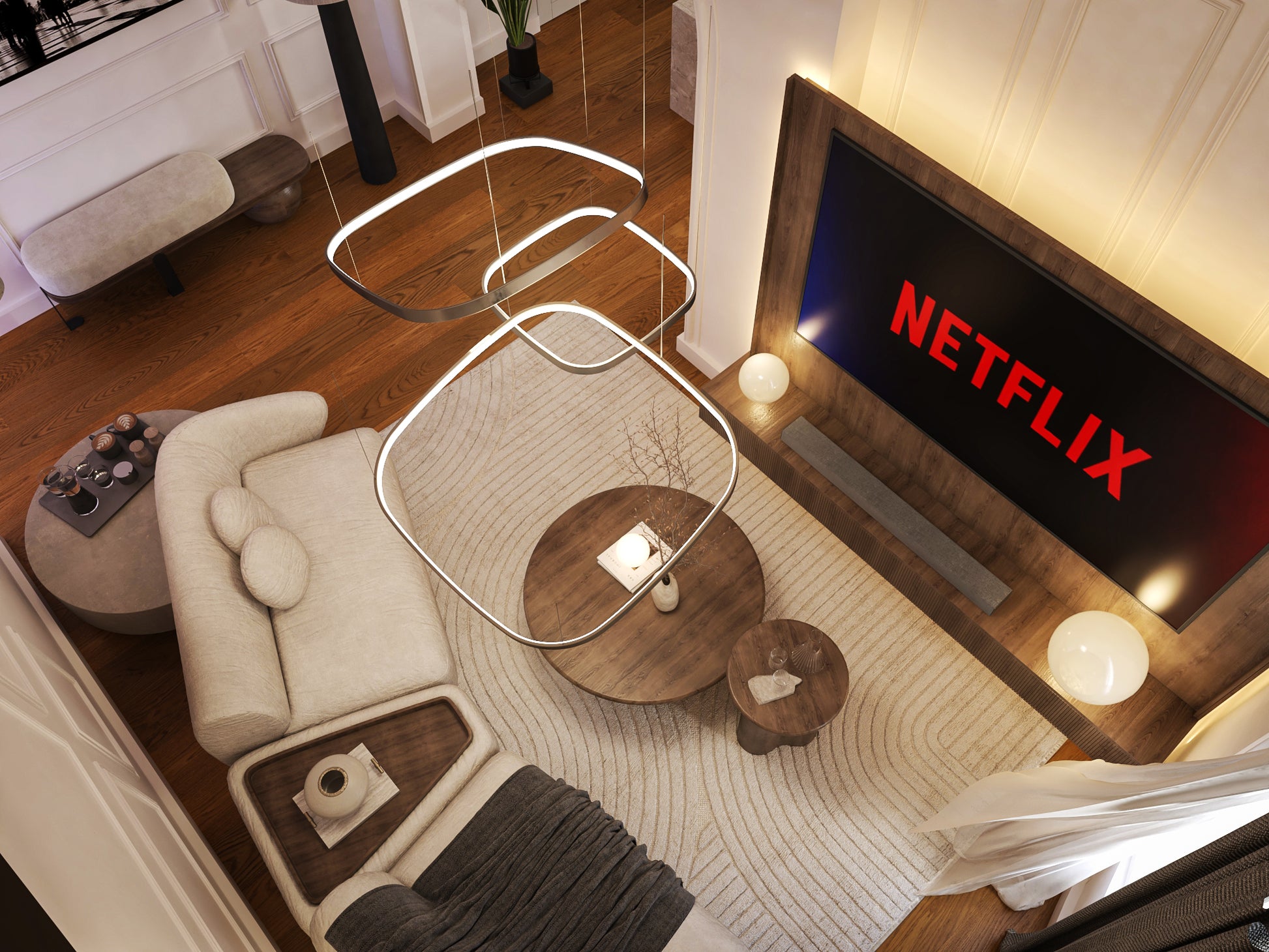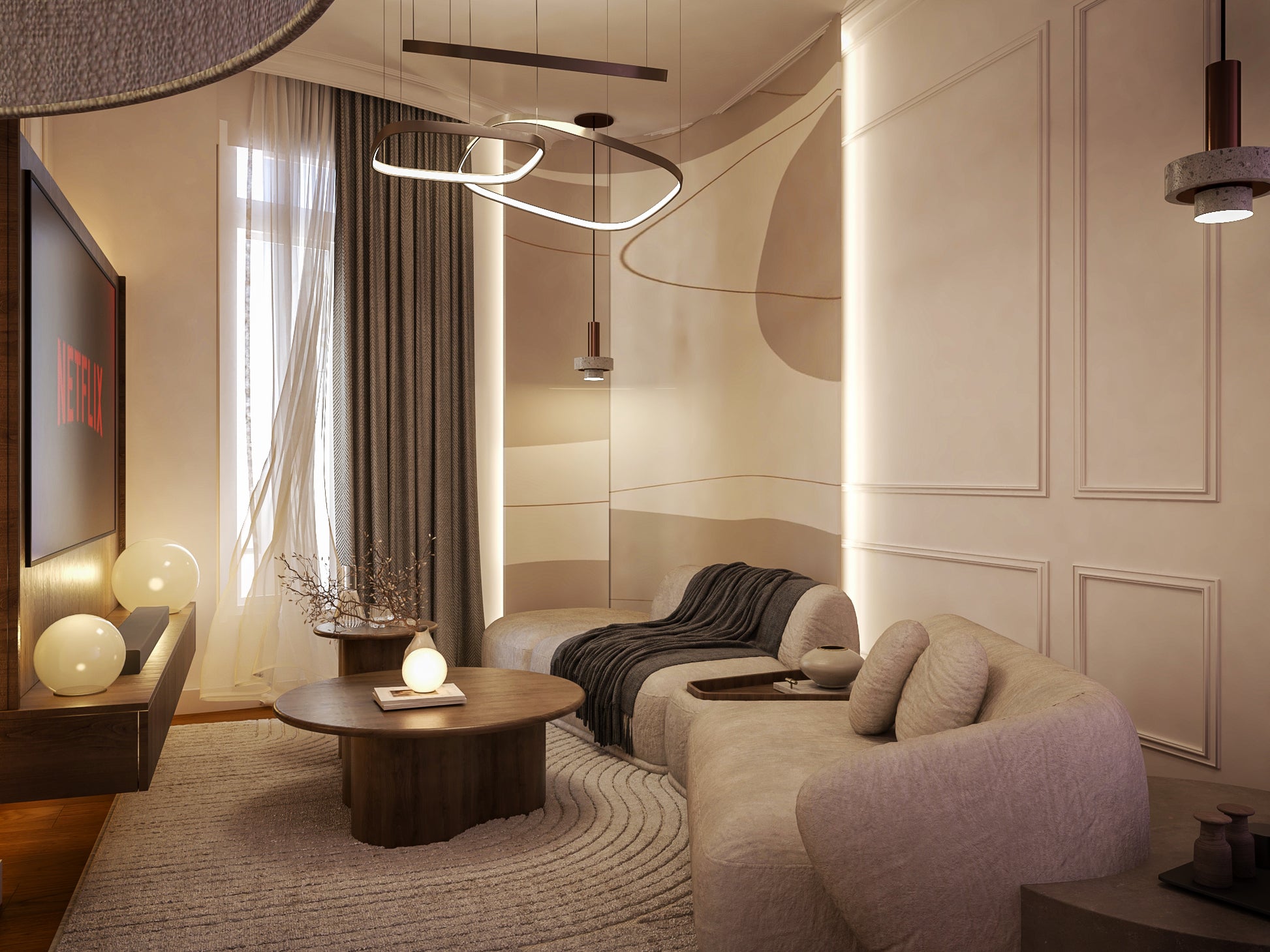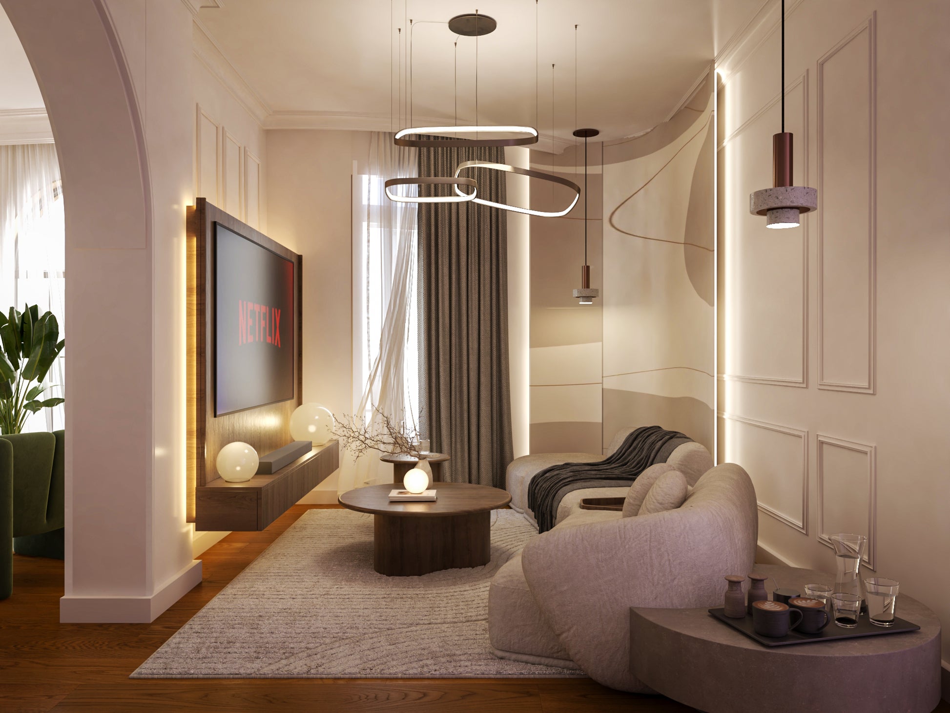 The **TV setup** includes a wooden cladding with integrated LED lighting, creating a warm, inviting ambiance and seamlessly tying the space together. Above, a **round gypsum feature** with an LED setup offers soft, ambient lighting, contributing to a cozy, well-lit environment perfect for both daytime lounging and evening gatherings.