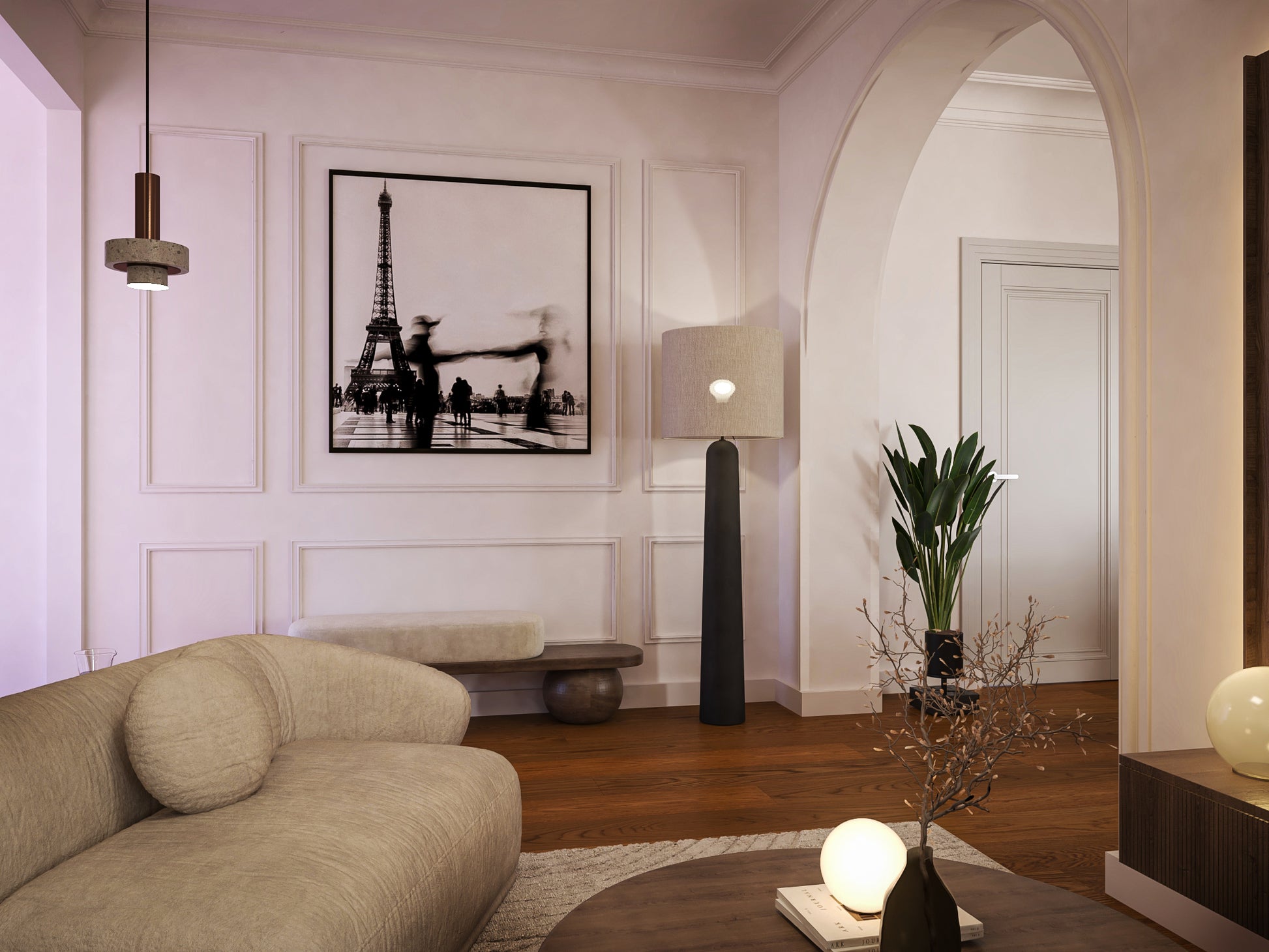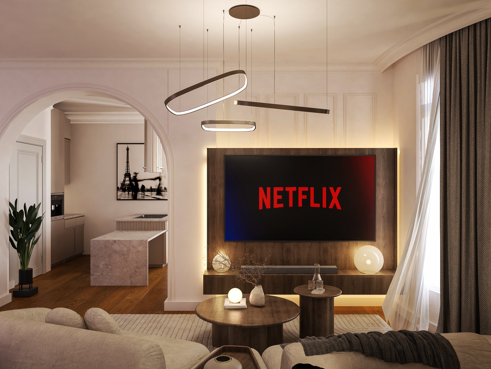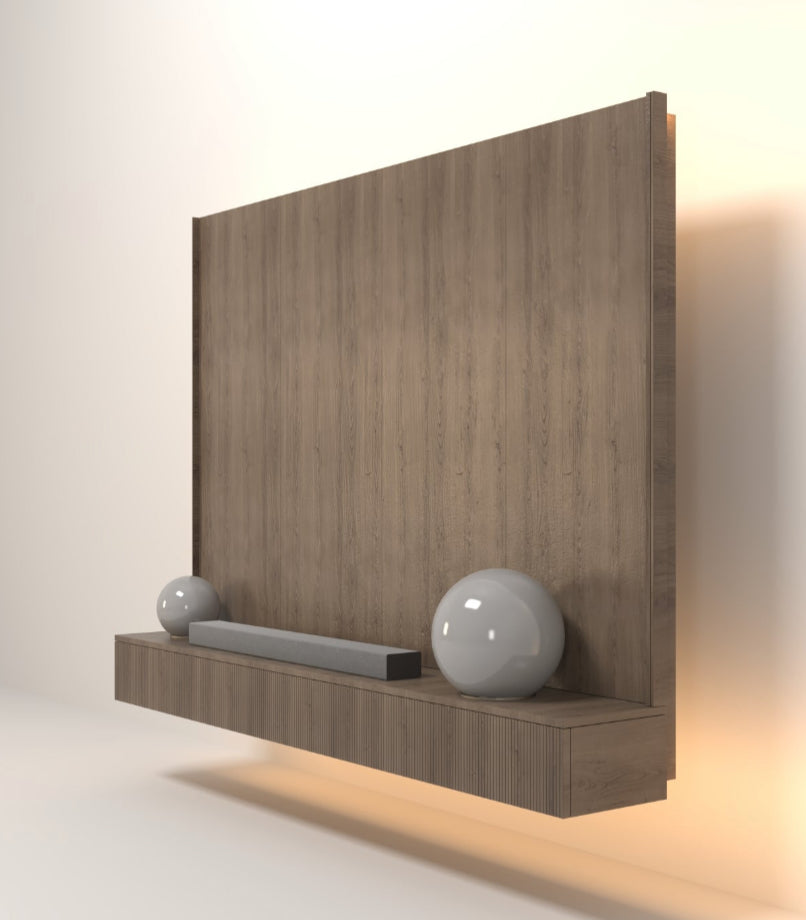 The **TV setup** includes a wooden cladding with integrated LED lighting, creating a warm, inviting ambiance and seamlessly tying the space together. Above, a **round gypsum feature** with an LED setup offers soft, ambient lighting, contributing to a cozy, well-lit environment perfect for both daytime lounging and evening gatherings.