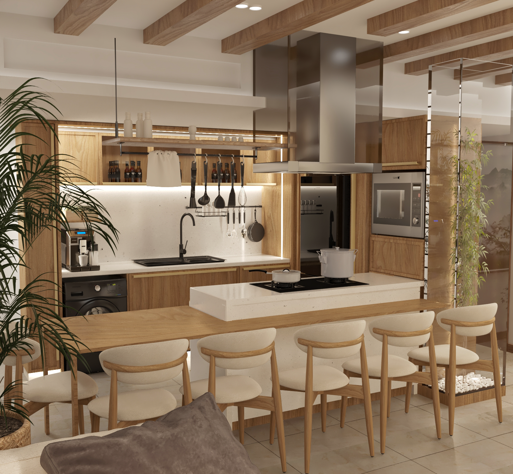 This 12m2 U-shaped kitchen is designed with a bold, modern aesthetic, featuring massive wood boards and a high-pressure laminate (HPL) setup for durability and style. The cabinetry is equipped with a range of mechanism solutions, including Blum or similar high-quality soft-close accessories, ensuring smooth, effortless functionality throughout. The space is further enhanced by a compact wooden dining extension with seating for 6, seamlessly integrated into the layout. The terrazzo countertops and backsplash provide a striking contrast, adding texture and elegance to the kitchen. The thoughtful combination of natural wood, HPL, and terrazzo, along with innovative storage and organizational solutions, creates a functional, sleek, and inviting space perfect for cooking and dining.