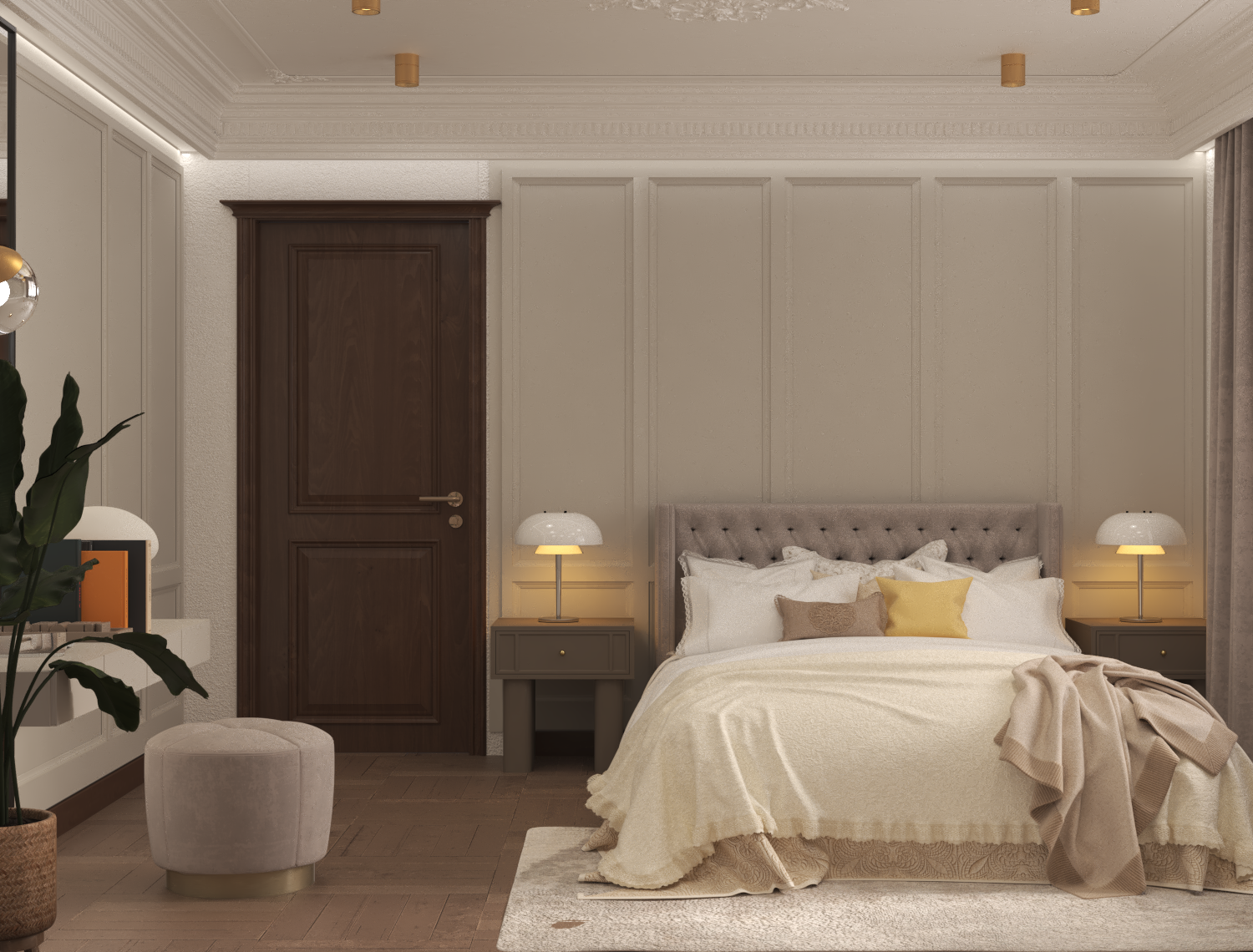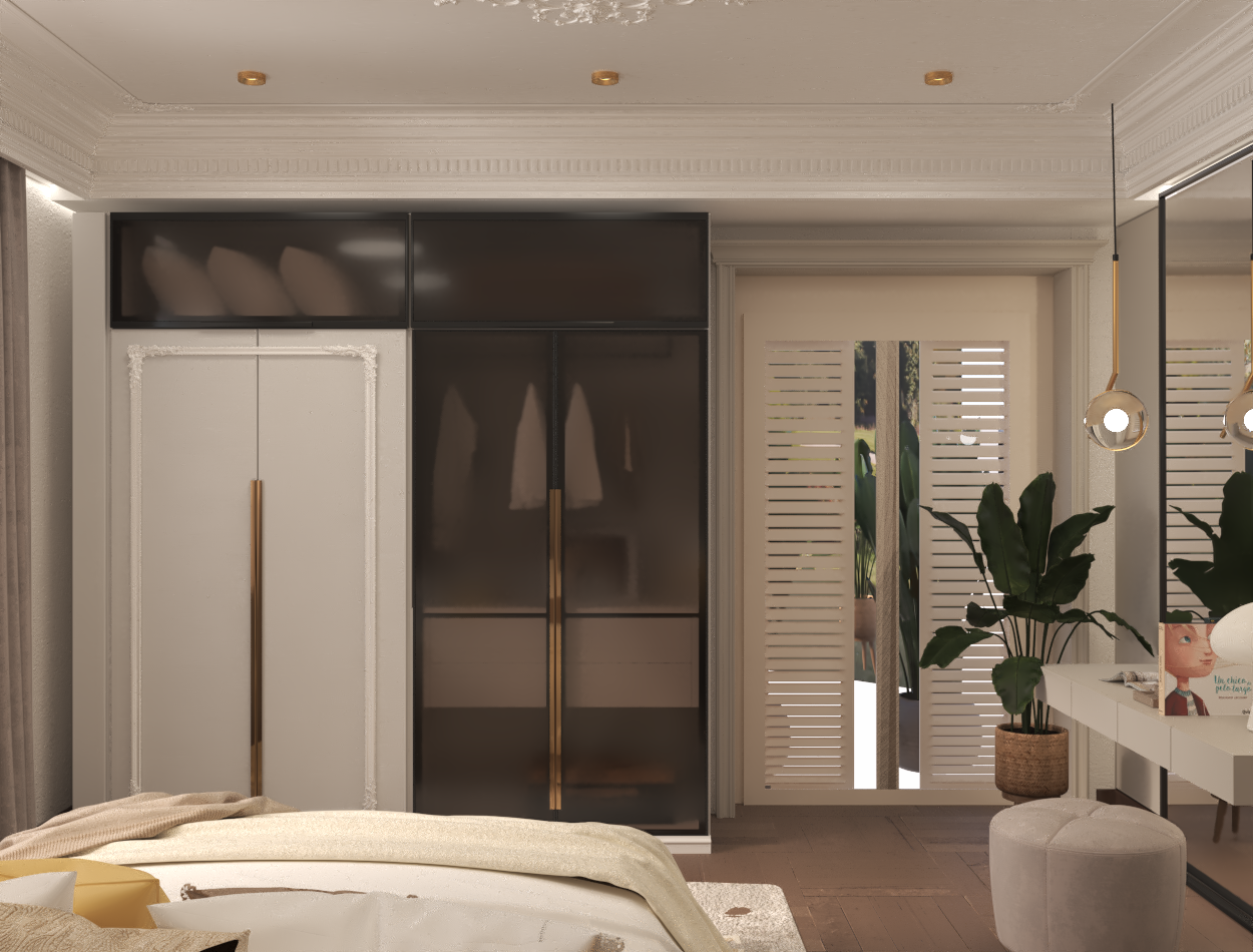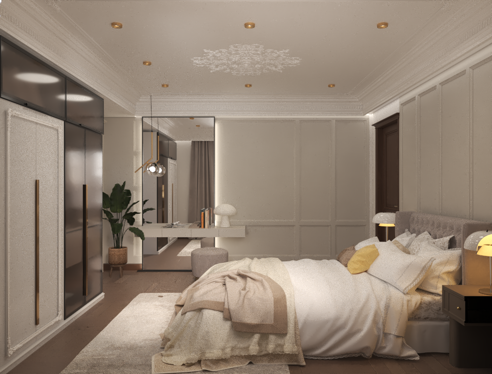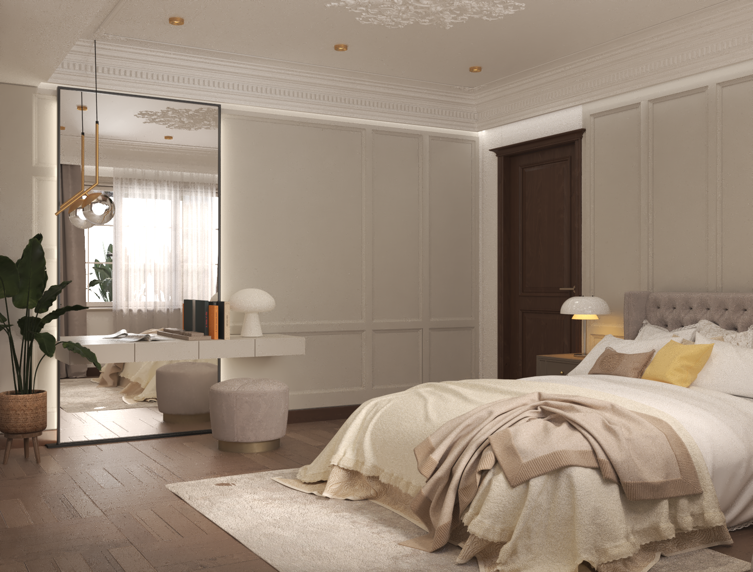 The Apex Suite features a king-size bed (queen available on request) set on a hydraulic lift storage base, complemented by an optional upholstered headboard and decorative wall cladding for an elegant focal point. The suite includes a full-span panoramic wardrobe with floor-to-ceiling mirrored or glazed sliding/hinged doors and integrated LED lighting. A dedicated vanity/hairdresser area is provided, complete with a substantial mirror, task lighting, drawers, countertop workspace, and convenient power outlets for styling tools. Together with premium linens, ambient and accent lighting, and high-end finishes—fabric or leather upholstery, polished metal or wood trim—the suite is designed to provide both utility and luxurious comfort in an expansive setting.