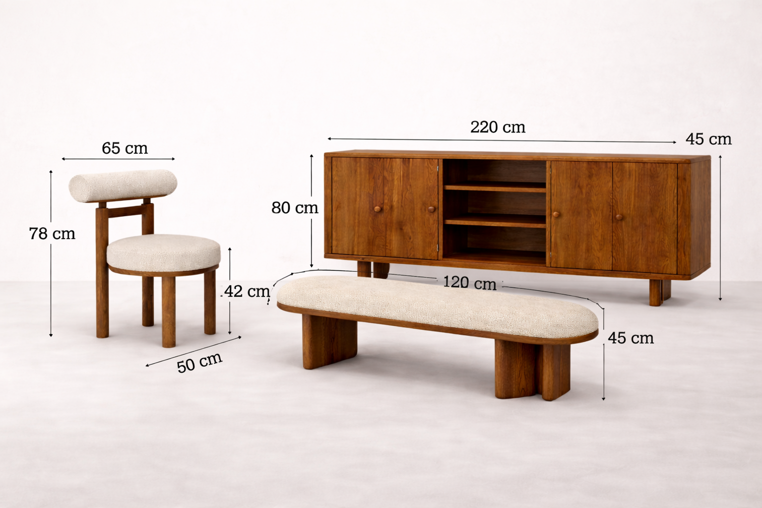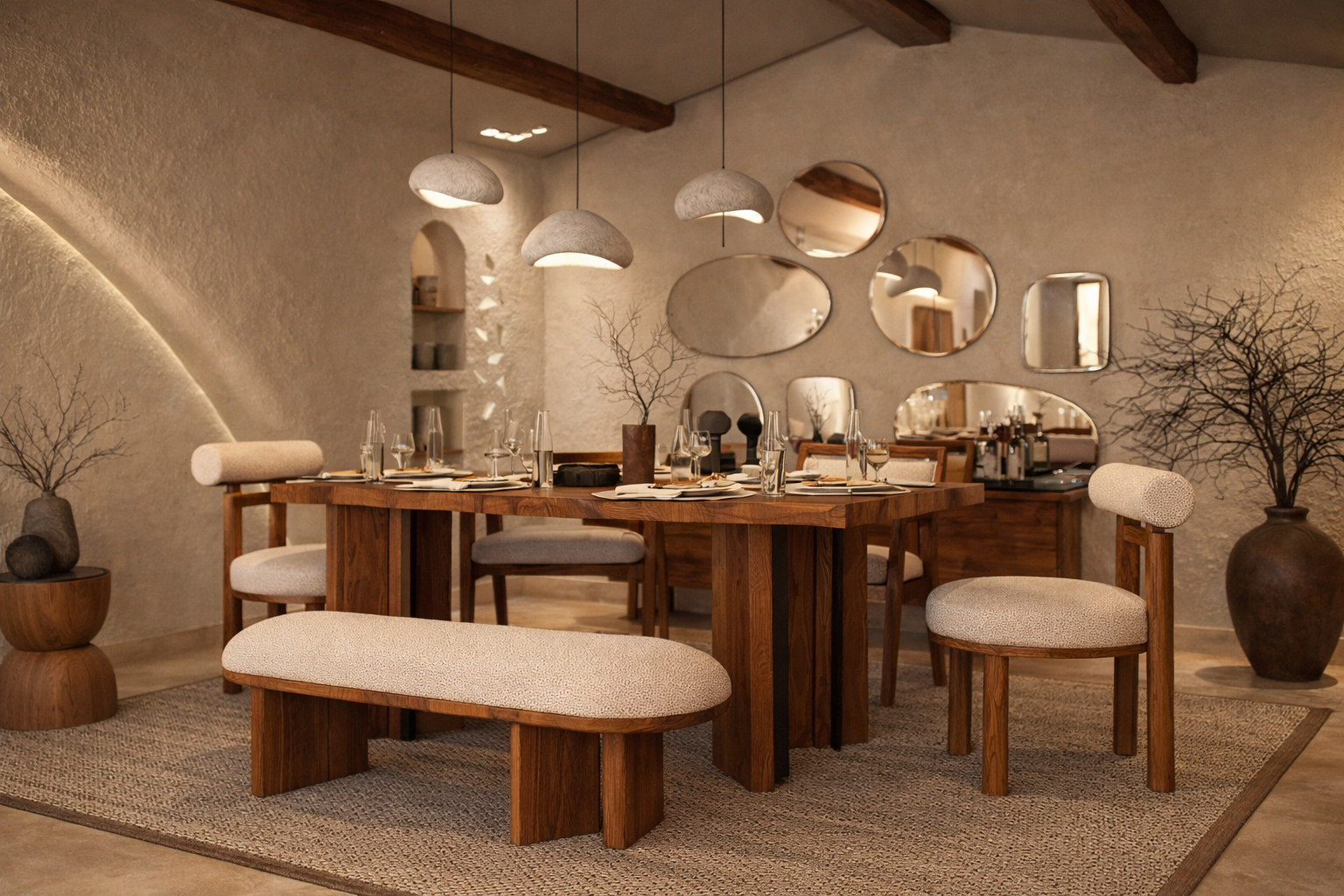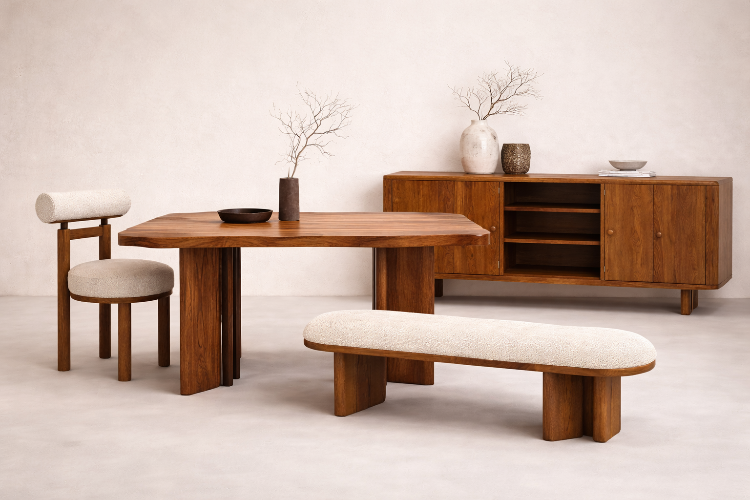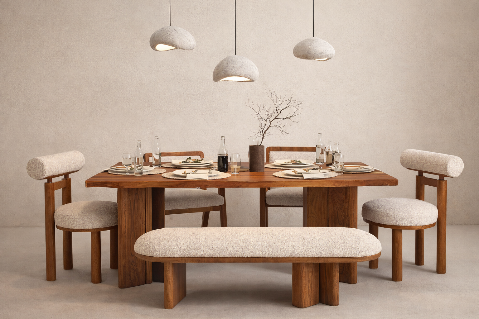 Its rustic charm is elevated with a refined silhouette, making it ideal for both modern and farmhouse interiors. The set includes four solid wood chairs and a streamlined backless bench for two, combining comfort, utility, and handcrafted elegance in one timeless design.